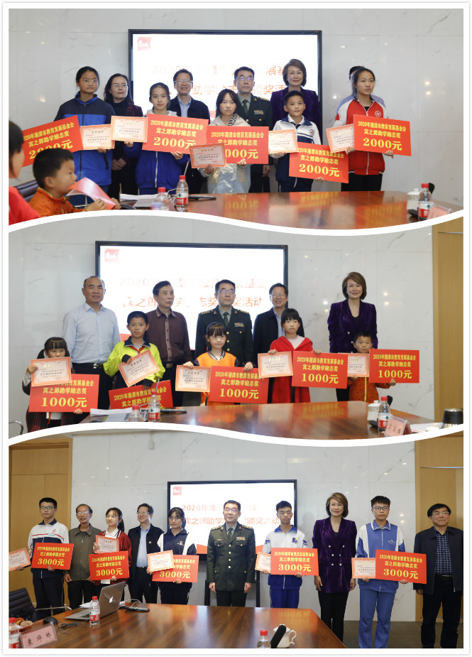 湘潭市政協副主席周佩珞宣讀《關于表彰2020年湘潭市教育發展基金·賓之郎助學勵志獎獲獎學生通報》,2020年,共有349名同學獲得“賓之郎·助學勵志獎”表彰獎勵。他表示,希望獲獎同學以堅強的意志,砥礪奮斗,處逆境而立志成才;也希望廣大中小學生以獲獎學生為榜樣,樹立遠大理想,發奮學習,做有理想、有志向、有擔當的新時代好少年,為實現中華民族偉大復興而拼搏奮進。