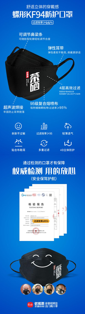 為給大家提供更安全的防疫裝備,本次派發的所有口罩均為經權威檢測的KF94標準,同時含有4層高效過濾,層層防護微米級過濾,能有效阻隔飛沫及空氣污染,95級復合熔噴布,吸附細微顆粒物過濾率≥95%,3D立體蝶形的設計,在具備足夠安全防護效果的同時,也能讓大家有更舒適的體驗。